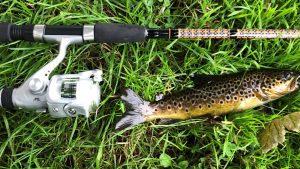 We squealed as the cold water gushed into our wellingtons. We then waded up the river swishing the sticks from side to side yawping and yelling so the trout would swim down into the waiting net. The river was never more than waist deep, but we had fierce craic when someone fell into a groyne or tripped on a big stone. Sometimes we were ‘skiting’ for hours before we caught a single fish. Sometimes we had a dozen or so silvery trout flapping furiously in the conical point of that enormous net.